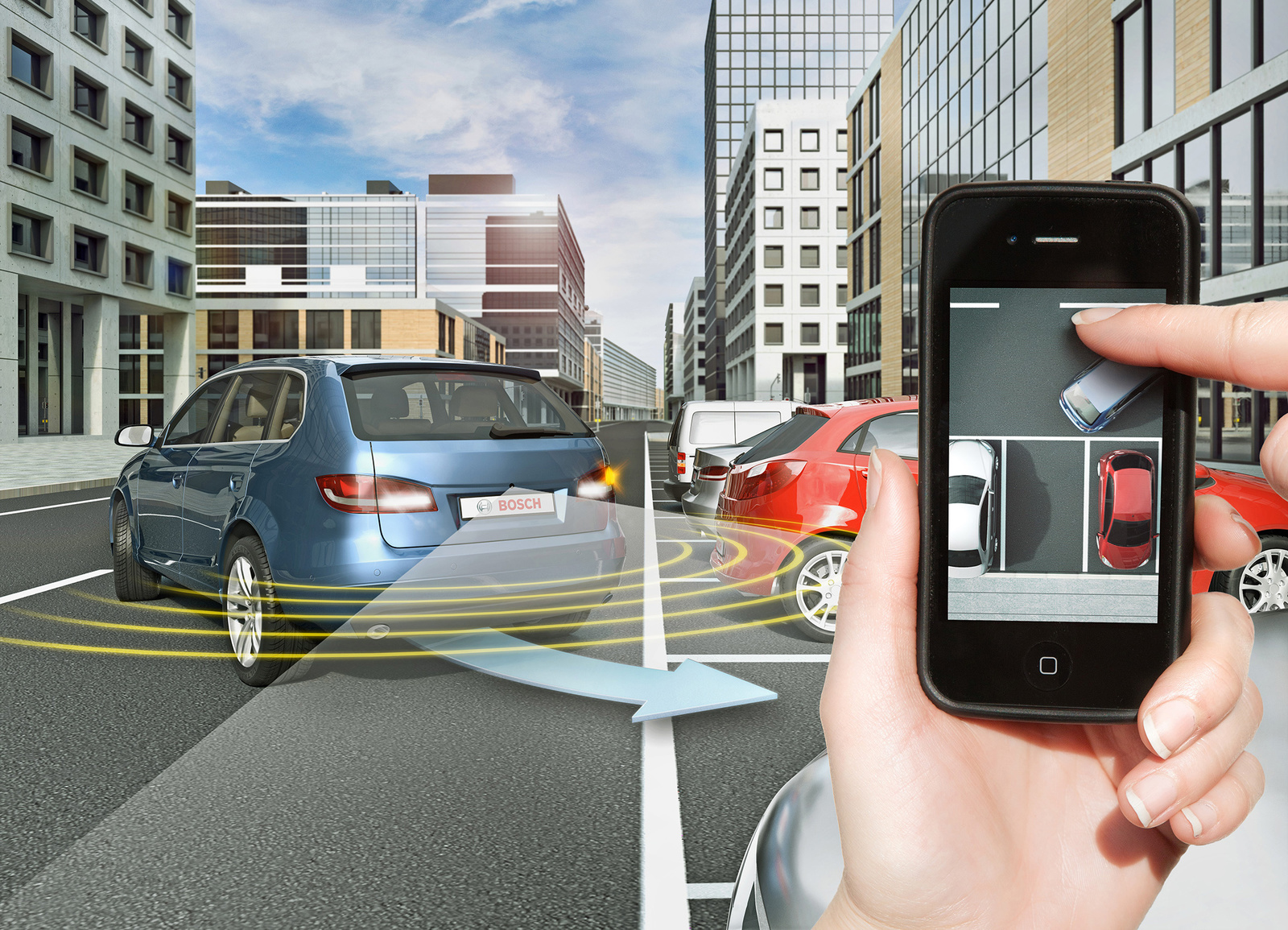 Bosch has all the essential expertise needed for automated driving, and now employs some 2,500 engineers in this area. The objective is to achieve completely automated, driverless parking within two years, and automated driving on freeways by the end of the decade. With the remotecontrolled park assist system, vehicles park themselves as if by magic. All drivers need to do is press and hold a button on their ignition key or smartphone. This tells the vehicle to automatically maneuver itself into the parking space it has previously detected and measured using ultrasonic sensors.